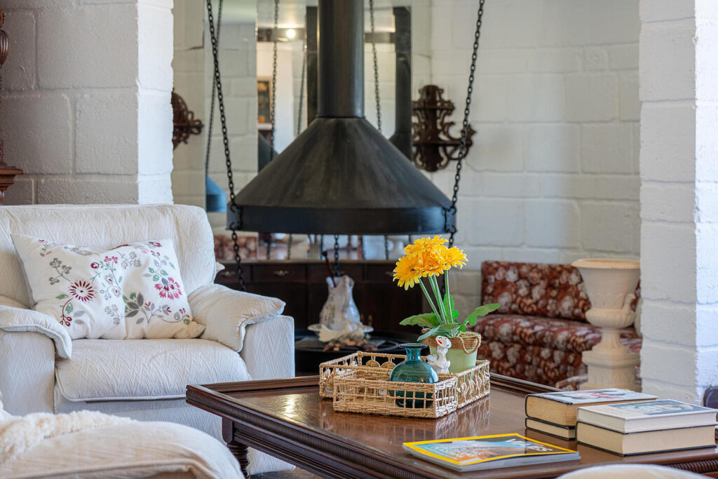 The fully equipped kitchen with laundry room and dedicated dining area connects to a unique circular lounge featuring a dramatic suspended fireplace — an extraordinary setting for intimate gatherings and unforgettable evenings.